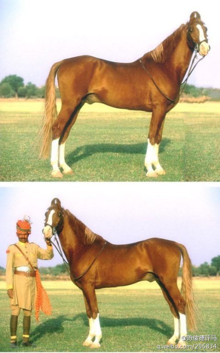 【印度马瓦里马】马瓦里(Marwari)是一个地名。此马能在干旱贫瘠地形很好生存、演化。血统与“阿拉伯马”有关联,可能是土库曼马杂交的后代,这种土库曼马曾经是中世纪亚历山大军队的战马。这种马耐得起严寒酷暑,可以长途疾驰,有着坚强铁蹄的良驹。印度马没有中国多,但是质数绝对优于中国。