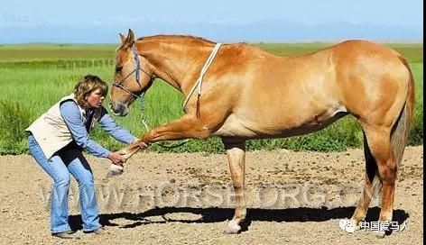站在马的前方稍靠右,面向马。用一只手抬起马的左腿,把另一只手放在马的膝盖后面,慢慢后退,把腿向前拉,由低向高抬起,直到你感到紧张,保持10s-15 s,但要确保马是舒服的。之后慢慢地把腿放回它的休息位置,重复两三次,看是否可以每次可以提高一点。