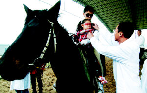 本报讯昨天上午,17位脑瘫患儿在脑瘫专家陪护下去看“马医生”。孩子们坐在了大红马“帅哥”的背上,快走或慢走、侧坐或倒骑,个个兴高采烈。专家介绍,这是利用马的规律性运动模式及人马互动的方式,对病患儿童的生理、心理、认知、社会化及行为障碍进行改善。